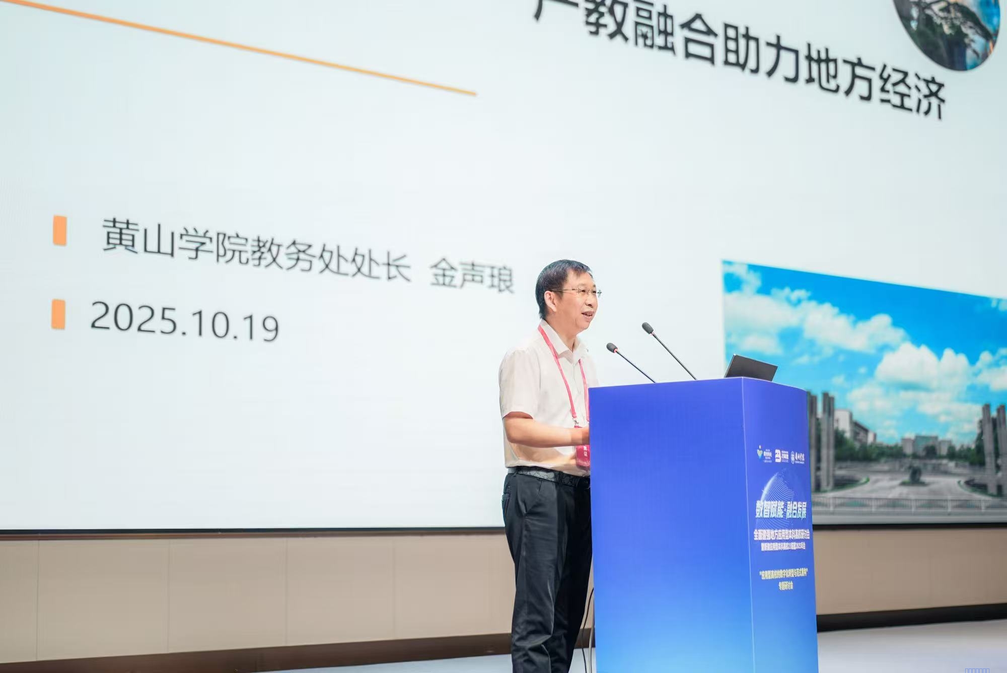 在“应用型高效的数字化转型与范式重构”专题研讨中,教务处处长金声琅教授以《数智赋能促进专业建设 产教融合助力地方经济》为题作专题报告,他从制度体系、实践举措、成效成果、后续计划等四个维度,分享了黄山学院在数智赋能与产教融合领域取得的实践成效。