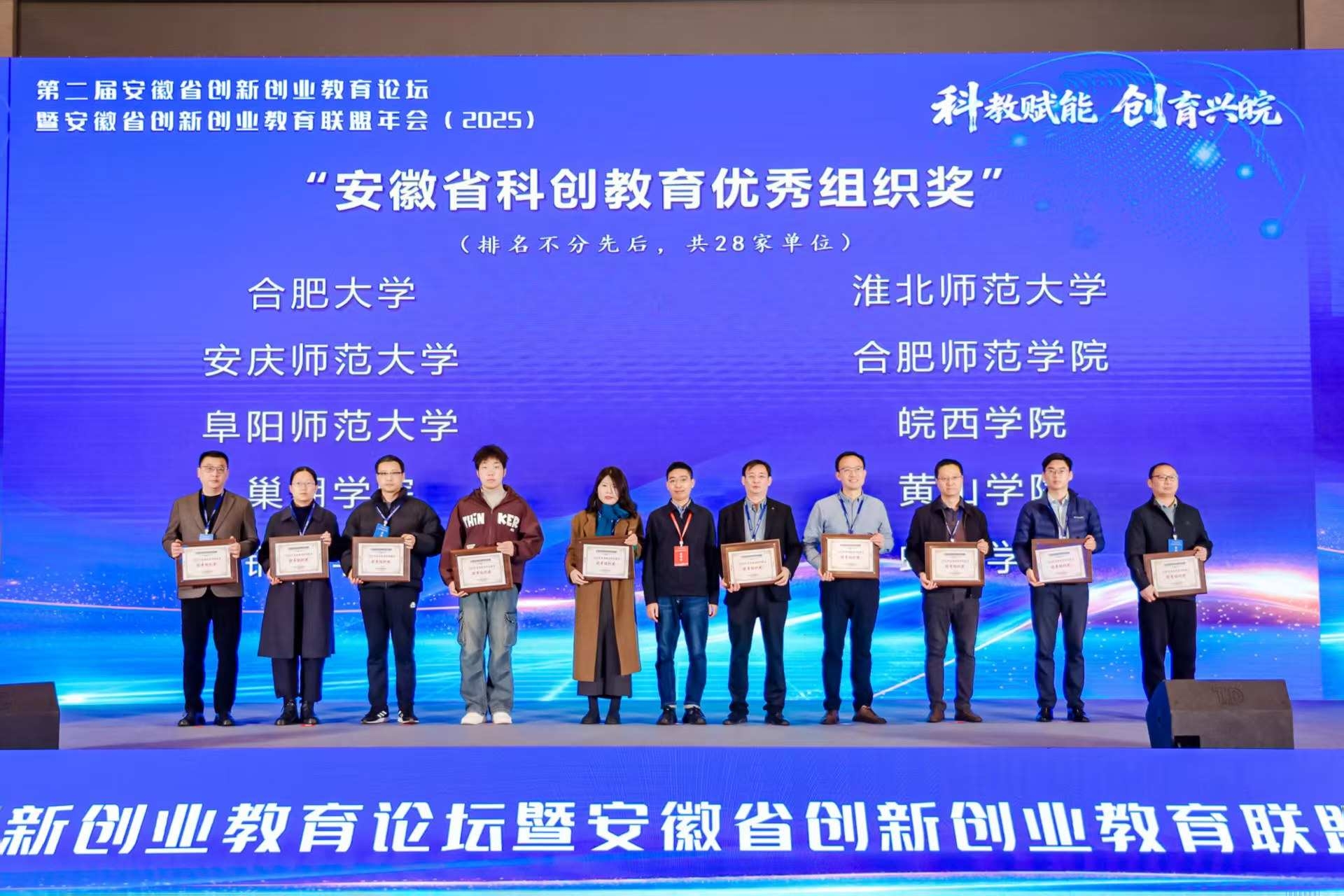 12月19日—20日,由安徽省教育厅、安徽省人力资源与社会保障厅、安徽省财政厅指导,安徽省创新创业教育联盟主办的第二届“安徽省创新创业教育论坛暨2025年安徽省创新创业教育联盟年会”在合肥举行。我校凭借在创新创业教育领域的丰硕成果,获评“2025年度安徽省科创优秀组织奖”,这是对我校双创育人工作的高度肯定,也是学校深化教育教学改革的重要成果。