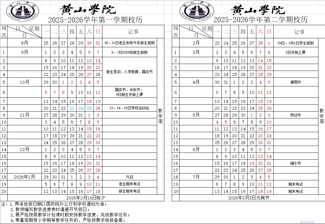 2025-2026学年度黄山学院校历以及作息时间表
